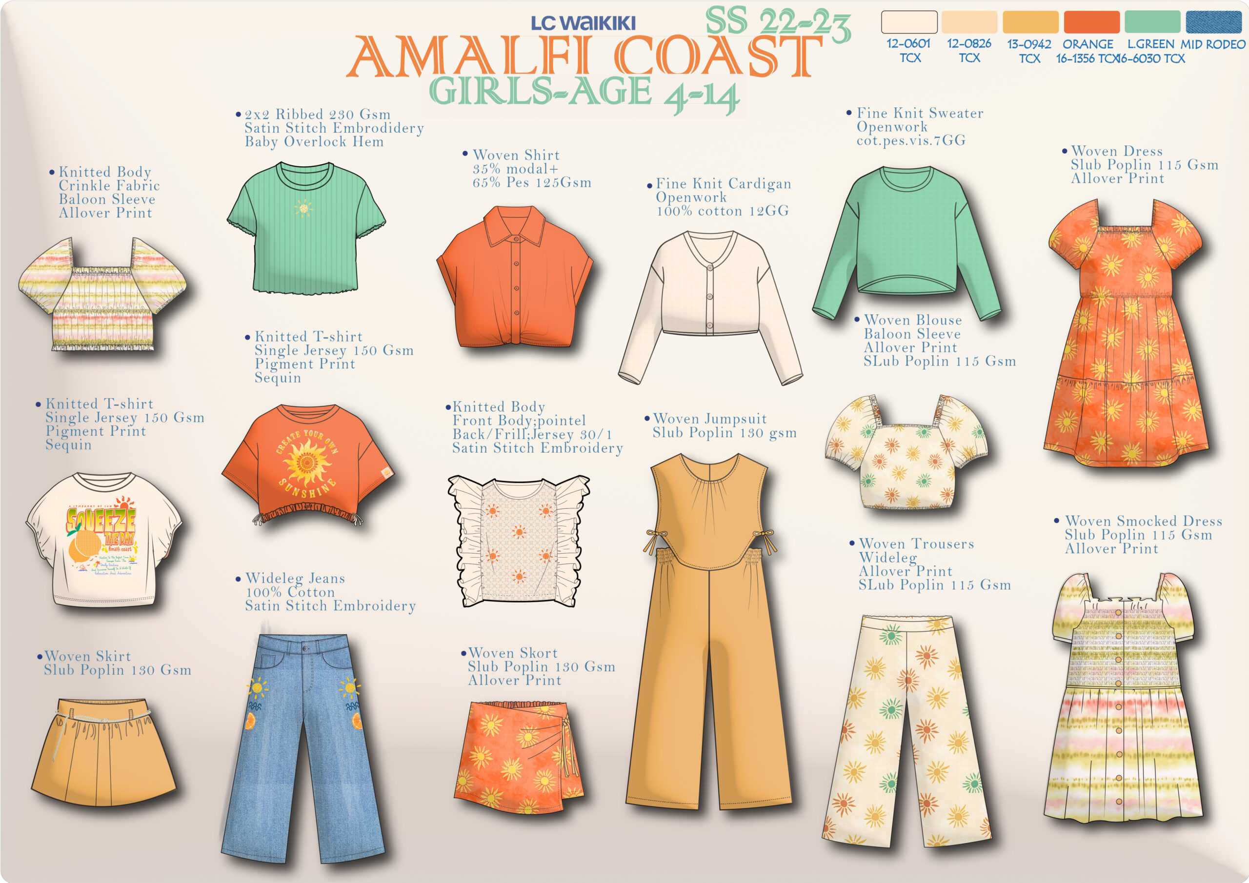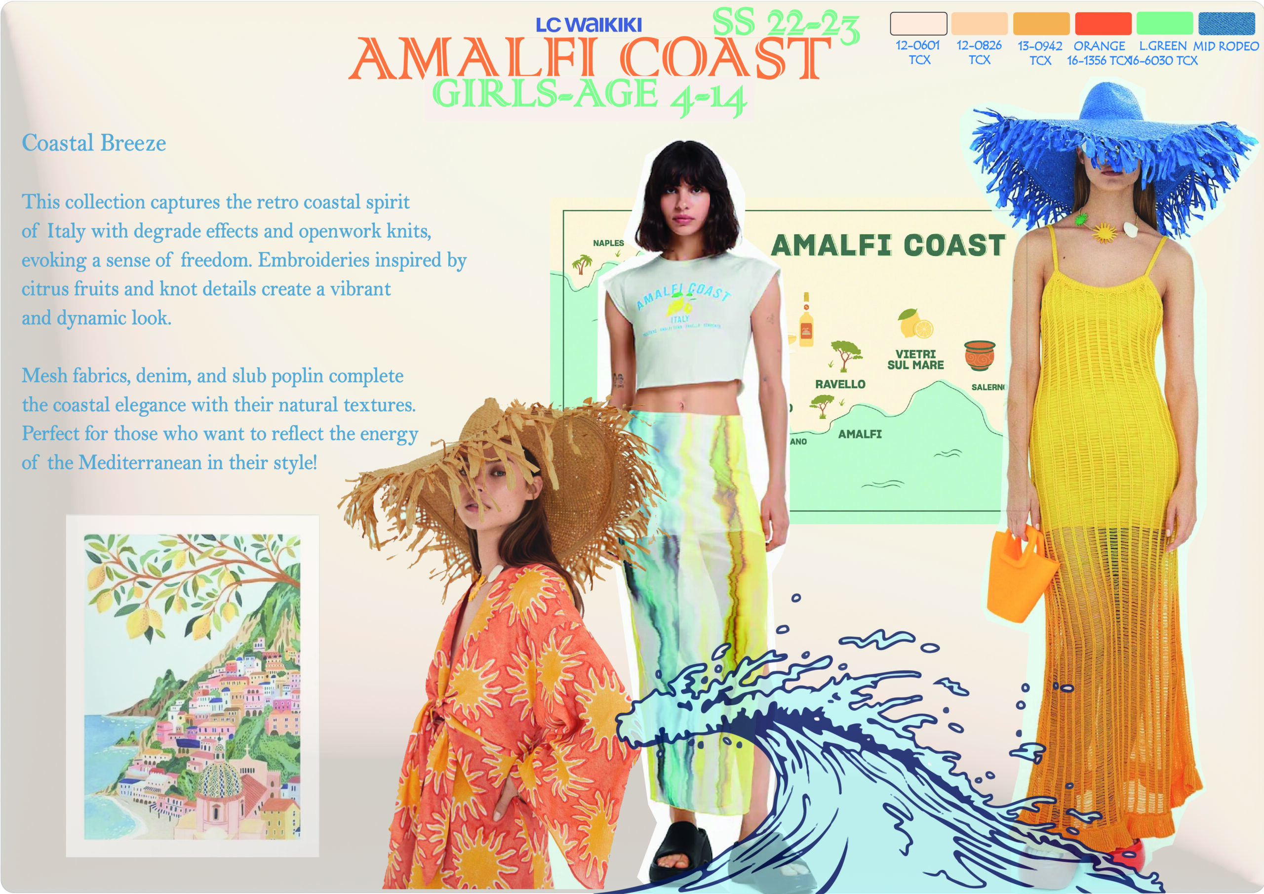 Designed for LC Waikiki in the summer of 2022, the Amalfi Coast collection draws inspiration from the vibrant spirit of the Mediterranean. Featuring gradient transitions, sun graphics, linen-blend natural fabrics, and warm tones, it reflects the joyful essence of sunny days and the colorful world of little girls.